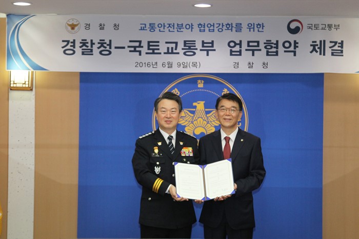 (서울=포커스뉴스) 강호인 국토교통부장관과 강신명 경찰청장이 9일 서울 종로구 경찰청에서 교통사고 사상자 줄이기 종합대책의 성공적 이행을 위해 '교통안전 강화를 위한 업무협약'을 체결하고 있다. <사진제공=국토교통부>