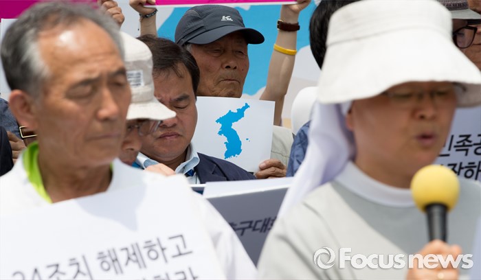 (서울=포커스뉴스) 8일 오전 서울 종로구 정부서울청사 앞에서 615공동선언실천 남측위원회가 6.15공동선언발표 16주년 기념 남북관계 개선 촉구 기자회견을 하고 있다.