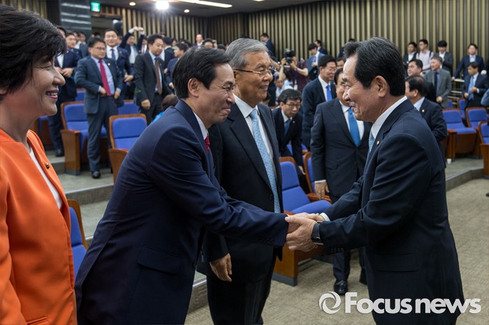 (서울=포커스뉴스) 정세균 더불어민주당 의원이 9일 오전 서울 여의도 국회에서 열린 의원총회에서 20대 국회 전반기 국회의장 후보로 선출된 뒤 우상호 원내대표와 악수 하고 있다.