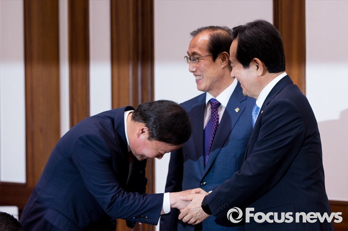 (서울=포커스뉴스) 정세균(오른쪽) 국회의장이 10일 오전 서울 여의도 국회에서 김재원(왼쪽) 청와대 정무수석과 면담에 앞서 악수 하고 있다.