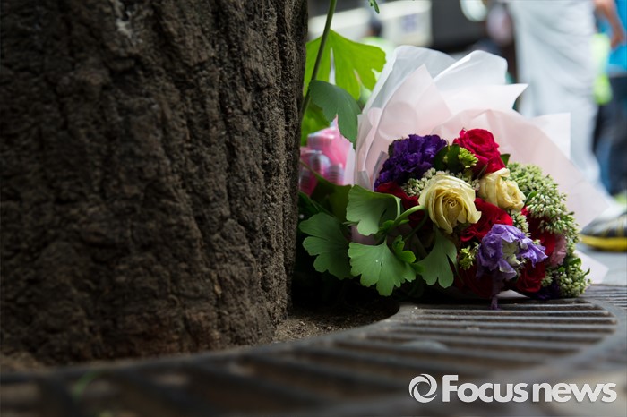(서울=포커스뉴스) 사내하청 전원 정규직화를 요구하며 고공농성을 벌여온 기아자동차 사내하청 노동자 최정명씨와 한규협씨가 농성을 해제한 8일 오후 서울 중구 옛 국가인권위원회 건물 옥상 광고탑 농성장을 내려와 병원으로 후송됐다. 고공농성자들에게 전달하려했던 꽃이 길에 놓여져 있다.