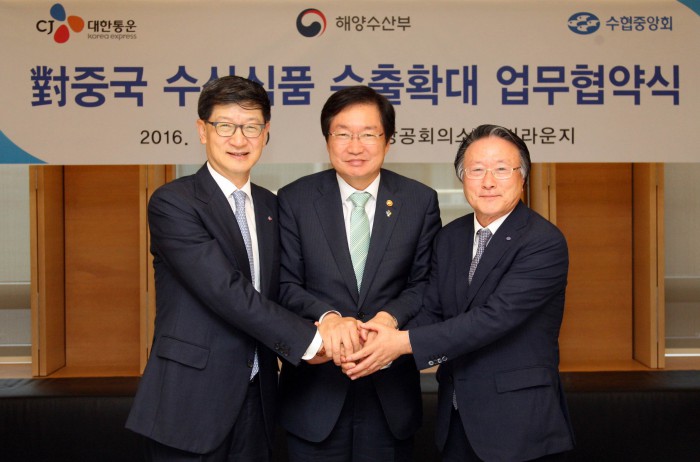 CJ대한통운은 해양수산부(이하 해수부), 수협중앙회(이하 수협)와 '대중국 수산식품 수출 확대를 위한 업무협약(MOU)'을 체결했다고 9일 밝혔다.