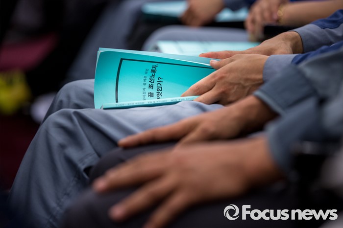 (서울=포커스뉴스) 조선산업 노동자들이 9일 오전 서울 여의도 국회도서관 강당에서 열린 '위기의 조선산업 및 노동자 구조조정 해법 모색 대토론회'에 참석 하고 있다.