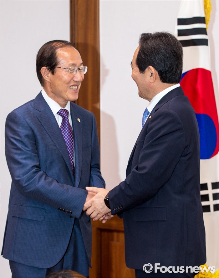 (서울=포커스뉴스) 정세균(오른쪽) 국회의장이 10일 오전 서울 여의도 국회에서 이원종 대통령비서실장과 면담에 앞서 악수 하고 있다.