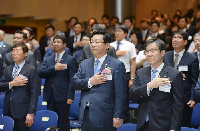 (서울=포커스뉴스) 주형환 산업통상자원부 장관이 9일 서울 포스코센터 서관 아트홀에서 열린 제17회 철의 날 기념식에 참석해 국기에 대한 경례를 하고 있다.