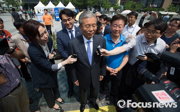 (서울=포커스뉴스) 김종인 더불어민주당 비상대책위원회 대표가 8일 오후 서울 광화문광장에서 지방재정제도 개편을 반대하며 무기한 단식농성 중인 이재명 성남시장을 만나 대화 후 농성장을 나서며 취재진 질문을 듣고 있다.