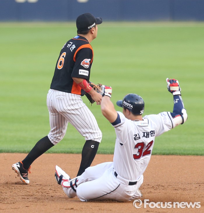 (서울=포커스뉴스) 10일 서울 잠실구장에서 열린 2016프로야구 롯데-두산 경기 2회말 2사후 두산 김재환이 우중간 안타를 치고 2루에서 세이프되고 있다.