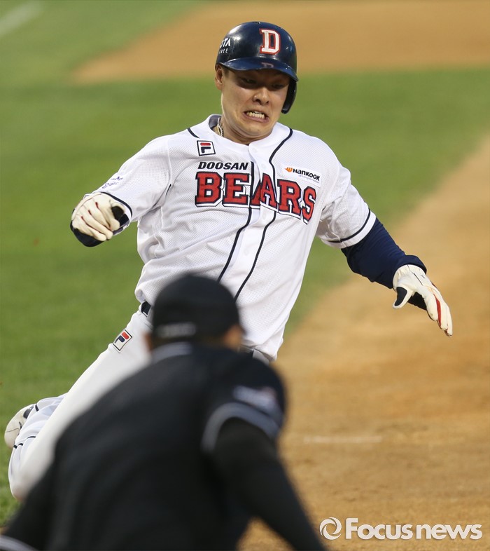(서울=포커스뉴스) 10일 서울 잠실구장에서 열린 2016프로야구 롯데-두산 경기 4회말 무사 1루에서 두산 에반스의 중견수 오른쪽 2루타때 1루주자 민병헌이 홈까지 달려 슬라이딩하고 있다.