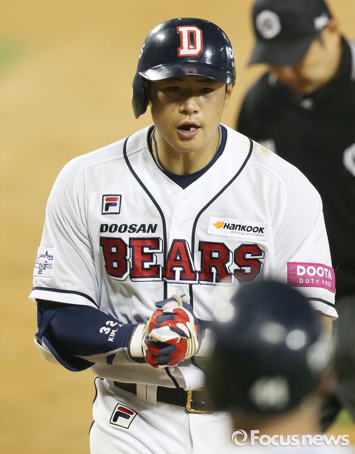 (서울=포커스뉴스) 10일 서울 잠실구장에서 열린 2016프로야구 롯데-두산 경기 6회말 무사 1,2루에서 두산 김재환이 우월 3점 홈런을 치고 박수치며 홈인하고 있다.