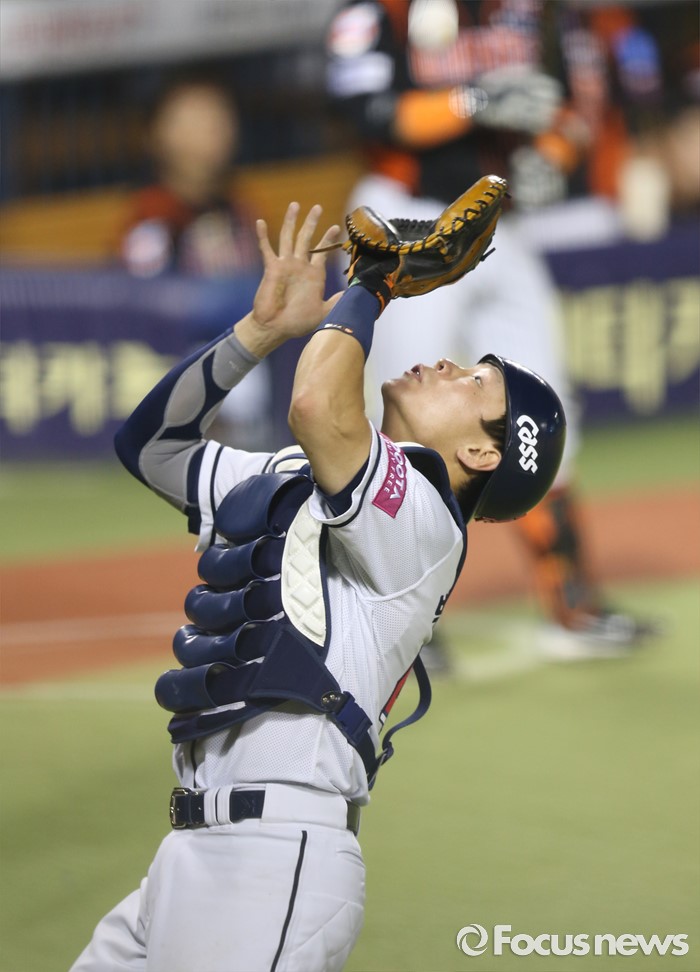 (서울=포커스뉴스) 10일 서울 잠실구장에서 열린 2016프로야구 롯데-두산 경기에서 9회말 두산 포수 박세혁이 롯데 박현도의 파을 볼을 잡고 있다.