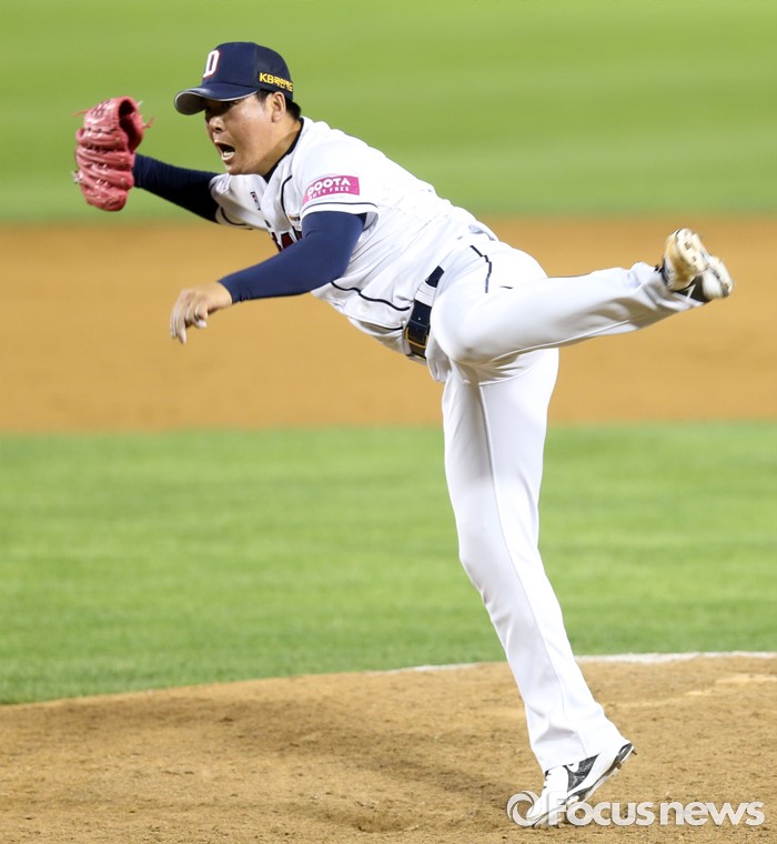 (서울=포커스뉴스) 10일 서울 잠실구장에서 열린 2016프로야구 롯데-두산 경기에서 두산 마무리 투수 이현승이 9회 등판해 전력투구하고 있다.