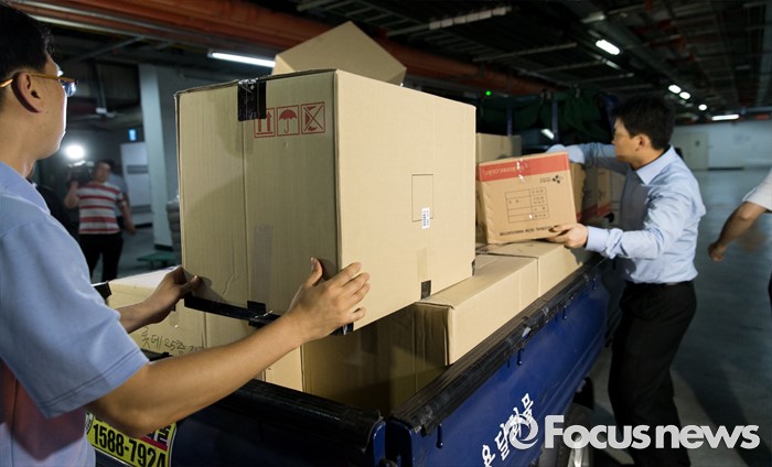 (서울=포커스뉴스) 10일 오후 서울 중구 소공동 롯데호텔에서 검찰 수사관들이 롯데그룹 정책본부 등 계열사와 신동빈 롯데그룹 회장 집무실에 대한 압수수색을 마치고 호텔을 나서고 있다.