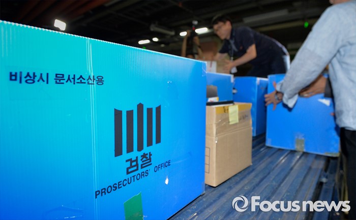 (서울=포커스뉴스) 10일 오후 서울 중구 소공동 롯데호텔에서 검찰 수사관들이 롯데그룹 정책본부 등 계열와 신동빈 롯데그룹 회장 집무실에서 압수수색한 서류를 화물차에 싣고 있다.