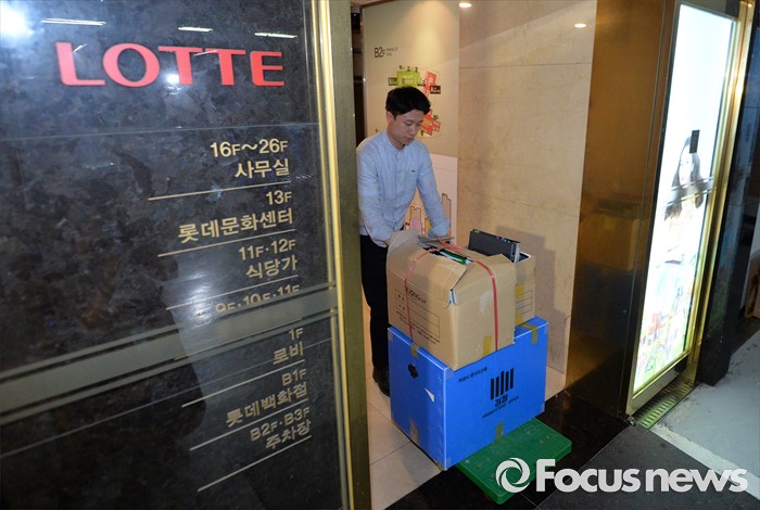 (서울=포커스뉴스) 10일 오후 서울 중구 소공동 롯데호텔에서 검찰 수사관들이 롯데그룹 정책본부 등 계열와 신동빈 롯데그룹 회장 집무실에서 압수수색한 서류를 화물차에 싣고 있다.