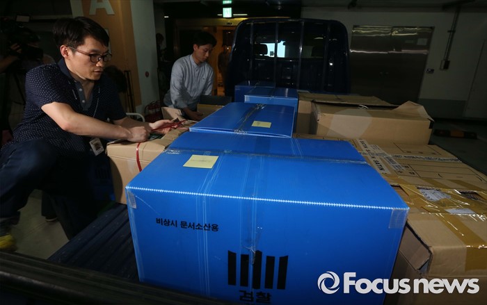 (서울=포커스뉴스) 10일 오후 서울 중구 소공동 롯데호텔에서 검찰 수사관들이 롯데그룹 정책본부 등 계열와 신동빈 롯데그룹 회장 집무실에서 압수수색한 서류를 화물차에 싣고 있다.