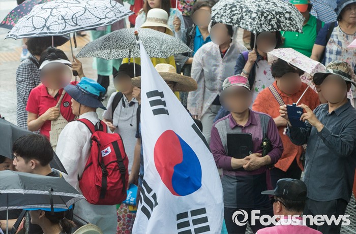 (서울=포커스뉴스) 11일 오후 서울 중구 시청역 인근에서 동성애 퀴어축제 반대 국민대회에 참석한 시민이 태극기로 비를 피하고 있다.