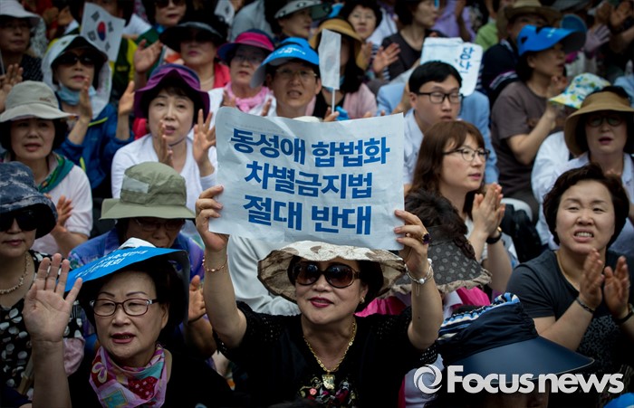 (서울=포커스뉴스) 11일 오후 서울 중구 대한문 앞에서 열린 '2016 서울광장 동성애축제 반대 국민대회'에서 참석자들이 동성애를 반대하는 손팻말을 들고 있다.