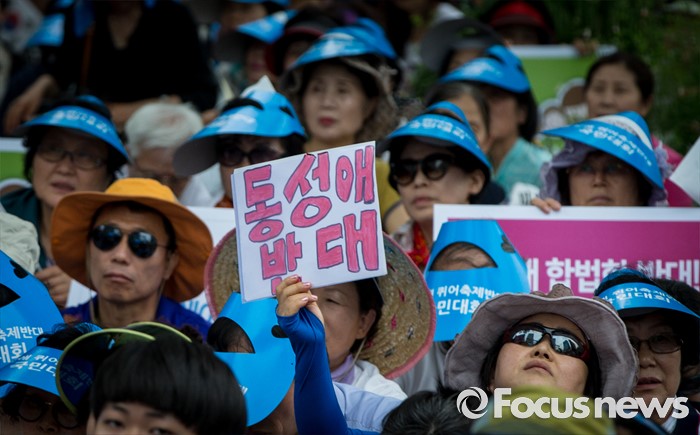 (서울=포커스뉴스) 11일 오후 서울 중구 대한문 앞에서 열린 '2016 서울광장 동성애축제 반대 국민대회'에서 참석자들이 동성애를 반대하는 손팻말을 들고 있다.