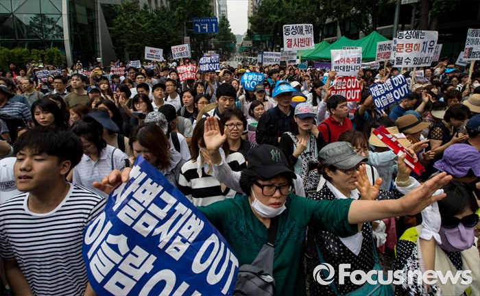 (서울=포커스뉴스) 11일 오후 제17회 퀴어문화축제 참가자들이 서울광장을 출발해 을지로일대를 지나며 퀴어퍼레이드를 벌이자 기독교인들이 반대편 도로에서 기도하고 있다.