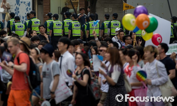 (서울=포커스뉴스) 11일 오후 제17회 퀴어문화축제 참가자들이 서울광장을 출발해 명동 일대를 지나며 퀴어퍼레이드를 벌이고 있다.