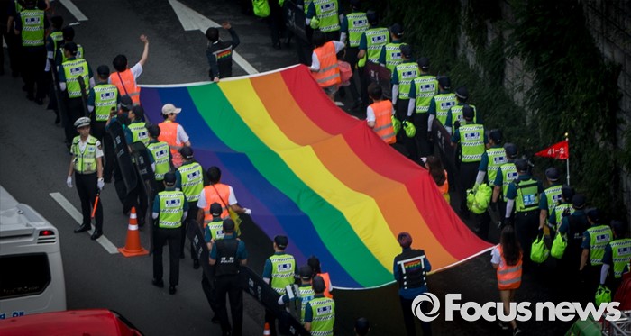 (서울=포커스뉴스) 11일 오후 제17회 퀴어문화축제 참가자들이 서울광장을 출발해 을지로 일대를 지나며 퀴어퍼레이드를 벌이고 있다.