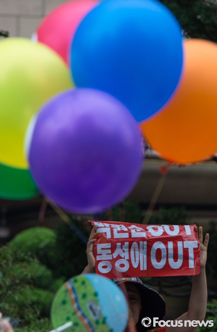 (서울=포커스뉴스) 11일 오후 제17회 퀴어문화축제 참가자들이 서울광장을 출발해 을지로일대를 지나며 퀴어퍼레이드를 벌이자 한 시민이 이를 규탄하는 손팻말을 들고 있다.