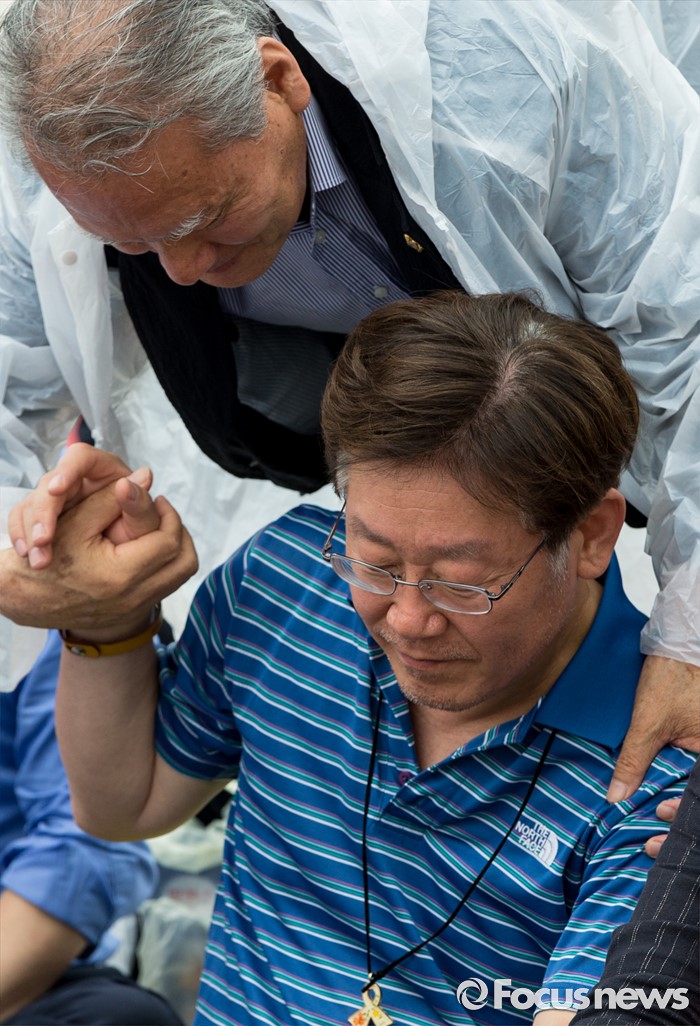 (서울=포커스뉴스) 11일 오후 서울 광화문광장에서 열린 지방재정 개악 저지 지방자치 수호 시민문화제에서 5일째 단식 중인 이재명 성남시장이 지지자와 인사하고 있다.