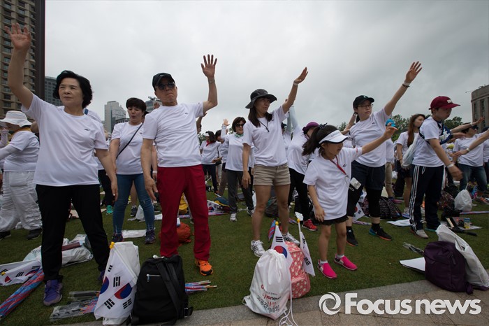 (서울=포커스뉴스) 12일 오전 서울 중구 서울시청 광장에서 열린 제 7회 나라사랑 고궁걷기 대회에 참가한 시민들이 출발 전 준비운동을 하고 있다.