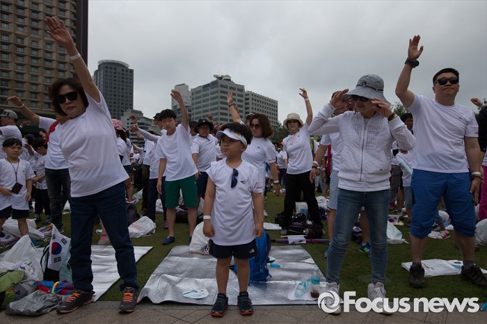 (서울=포커스뉴스) 12일 오전 서울 중구 서울시청 광장에서 열린 '제7회 나라사랑 고궁걷기 대회'에 참가한 시민들이 준비운동을 하고 있다.