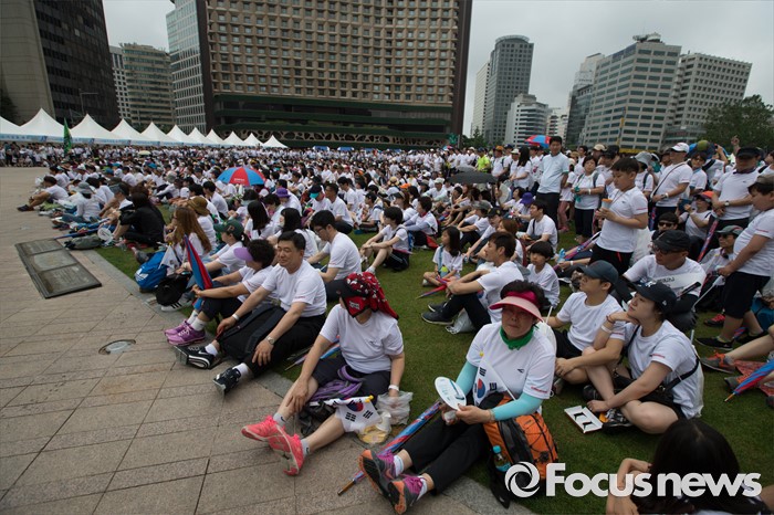(서울=포커스뉴스) 12일 오전 서울 중구 서울시청 광장에서 열린 제 7회 나라사랑 고궁걷기 대회에 시민들이 참가하고 있다.