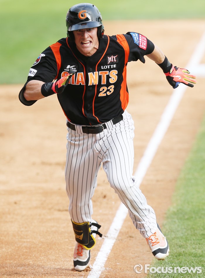 (서울=포커스뉴스) 12일 서울 잠실구장에서 열린 2016 프로야구 롯데-두산 경기 3회초 롯데 선두타자 아두치가 중견수를 넘기는 3루타와 송구 실책을 틈타 홈으로 달리고 있다.