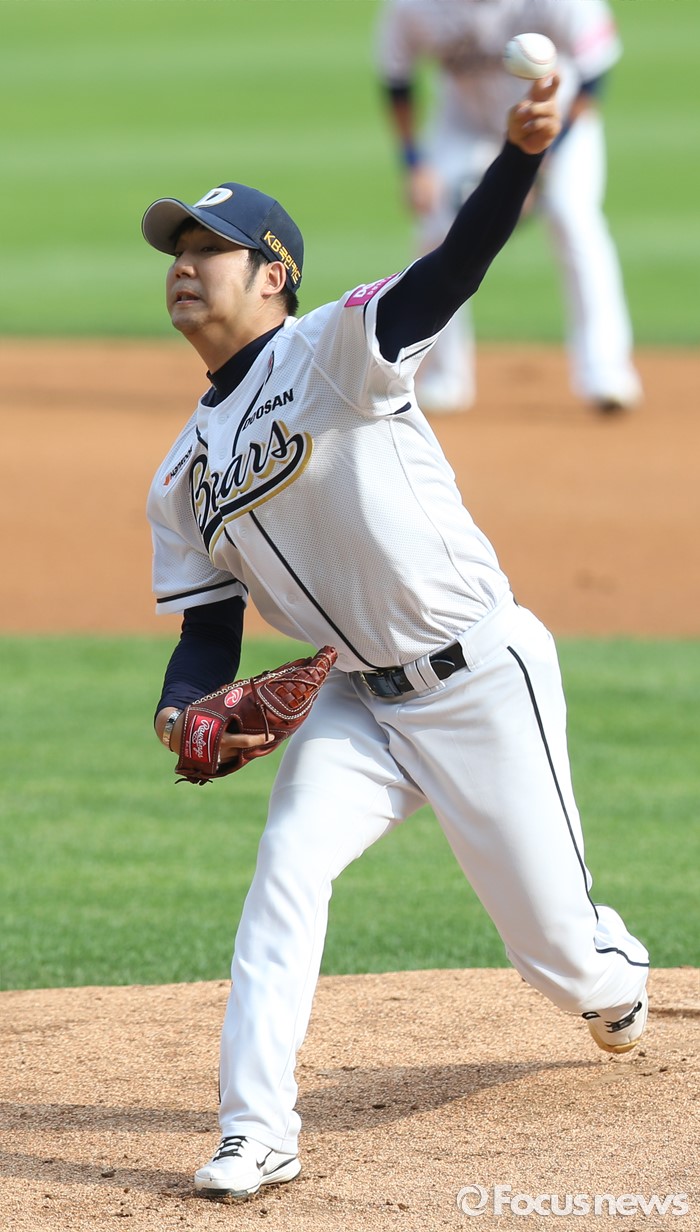 (서울=포커스뉴스) 12일 서울 잠실구장에서 열린 2016프로야구 롯데-두산 경기에서 1회초 두산 선발투수 장원준이 투구하고 있다.