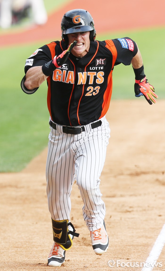 (서울=포커스뉴스) 12일 서울 잠실구장에서 열린 2016 프로야구 롯데-두산 경기 3회초 롯데 선두타자 아두치가 중견수를 넘기는 3루타와 송구 실책을 틈타 홈으로 달리고 있다.