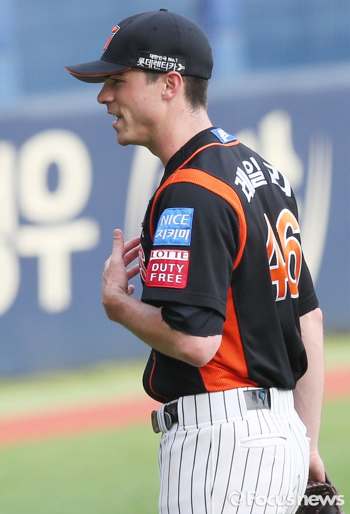 (서울=포커스뉴스) 12일 서울 잠실구장에서 열린 2016 프로야구 롯데-두산 경기에서 롯데 투수 레일리가 4회 수비를 마치고 덕아웃으로 가며 자신의 실책으로 실점한 것을 자책하고 있다.