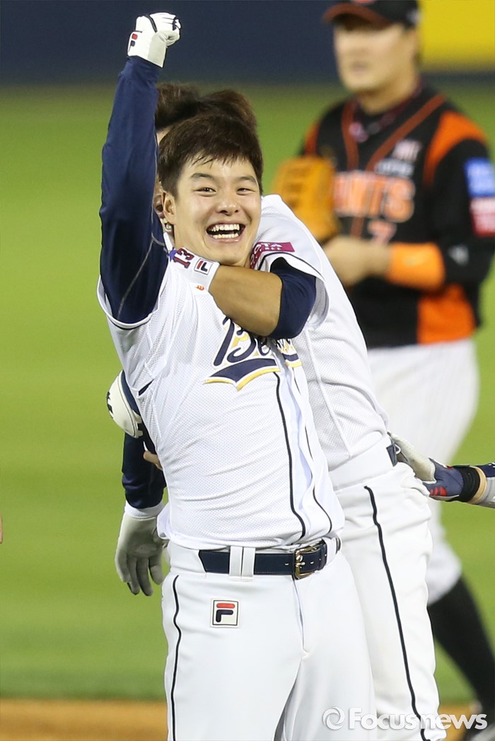 (서울=포커스뉴스) 12일 서울 잠실구장에서 열린 2016 프로야구 롯데-두산 경기에서 연장 11회말 끝내기 2루타를 친 두산 민병헌이 동료들과 환호하고 있다.