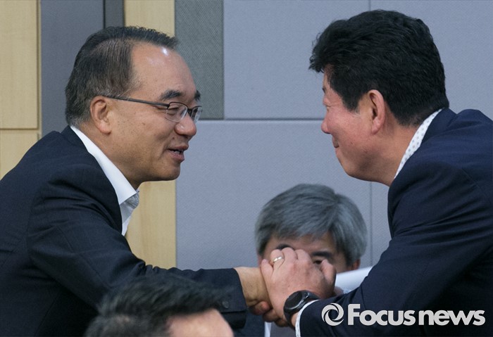 (서울=포커스뉴스) 13일 오전 서울 여의도 국회 의원회관에서 '개헌, 우리 시대의 과제'란 주제로 열린 14차 국가전략포럼에 참석한 박재완(왼쪽) 한반도선진화재단 이사장과 박재호 더불어민주당 의원이 인사하고 있다.