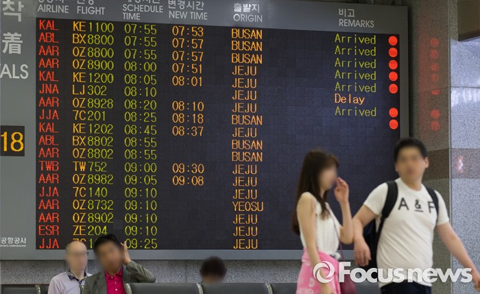 (서울=포커스뉴스) 13일 오전 서울 김포공항 국내선 청사에 항공기 도착 정보가 게시되고 있다. 지난 12일 오후 저시정특보가 내려진 제주공항은 짙은 안개와 연결편 문제로 150여편 지연 운항, 2편 결항했지만 13일 오전 6시에 특보를 해제했으며 오전 9시 현재 모든 항공편이 정상 운항하고 있다고 밝혔다.