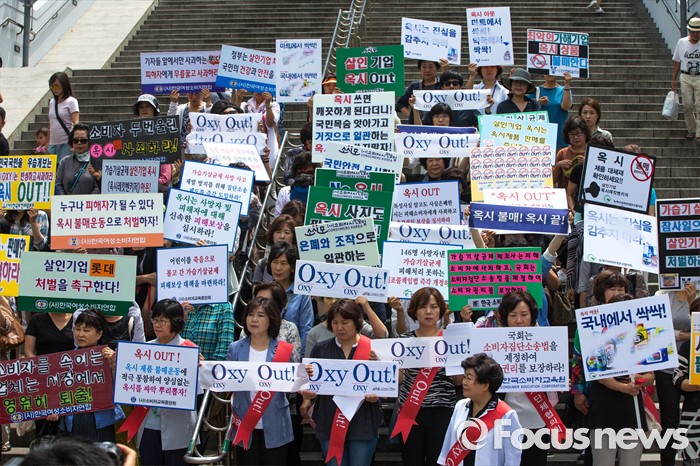 (서울=포커스뉴스) 13일 오전 서울 용산구 롯데마트 서울역점 앞에서 소비자단체 회원들이 롯데마트의 자사 가습기 살균제품 피해에 대한 책임있는 행동을 촉구하고 옥시 제품 판매 중단을 요구하는 집회를 하고 있다.
