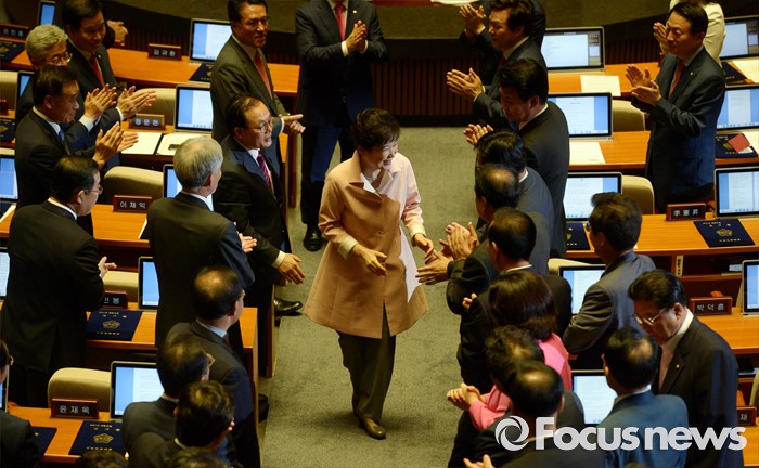 (서울=포커스뉴스) 박근혜 대통령이 13일 오전 서울 여의도 국회에서 열린 20대 국회 개원식에 참석해 연설을 마친 뒤 퇴장하며 의원들과 인사하고 있다.