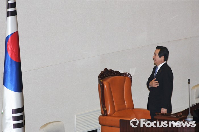 (서울=포커스뉴스) 13일 오전 서울 여의도 국회에서 열린 20대 국회 개원식에 참석한 정세균 국회의장이 국기에 대한 경례를 하고 있다.