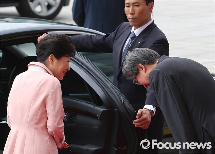 (서울=포커스뉴스) 박근혜(왼쪽) 대통령이 13일 오전 서울 여의도 국회에서 열린 20대 국회 개원식에 참석해 연설을 마친 뒤 박형준 국회 사무총장의 배웅을 받고 있다.