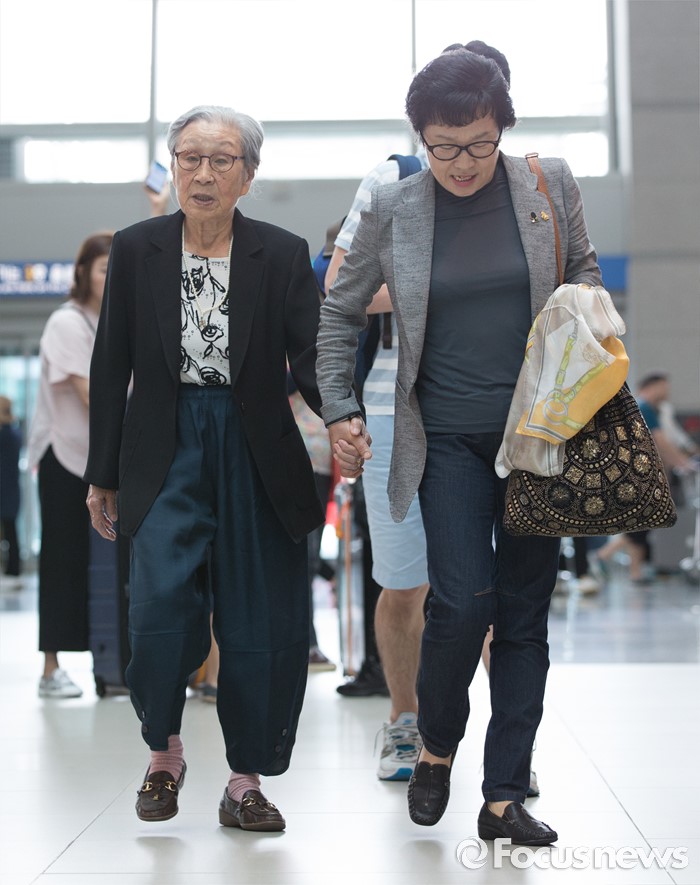 (인천공항=포커스뉴스) 일본군 위안부 피해자인 김복동(왼쪽) 할머니가 유엔 인권이사회에 참석하기 위해 13일 오전 인천국제공항 출국장으로 들어서고 있다.