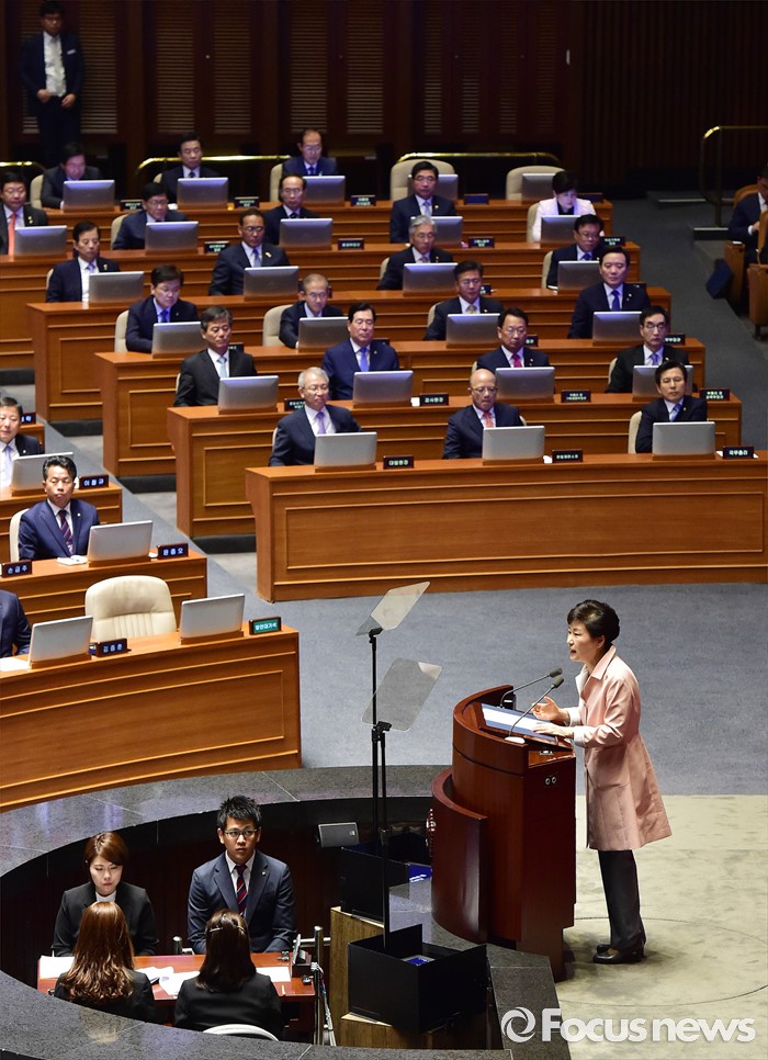 (서울=포커스뉴스) 박근혜 대통령이 13일 오전 서울 여의도 국회에서 열린 20대 국회 개원식에 참석해 연설을 하고 있다.