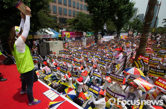 (서울=포커스뉴스) 13일 오후 서울 여의도 KB국민은행 앞에서 한국가정어린이집연합회 회원들이 맞춤형 보육 저지와 누리과정 예산 해결 및 평등지원 촉구하는 율동을 선보이고 있다.