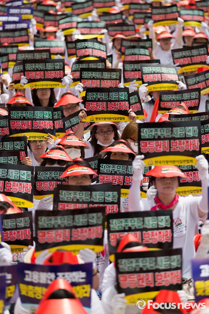 (서울=포커스뉴스) 13일 오후 서울 여의도 KB국민은행 앞에서 한국가정어린이집연합회 회원들이 맞춤형 보육 저지와 누리과정 예산 해결 및 평등지원을 촉구하는 결의대회를 하고 있다.