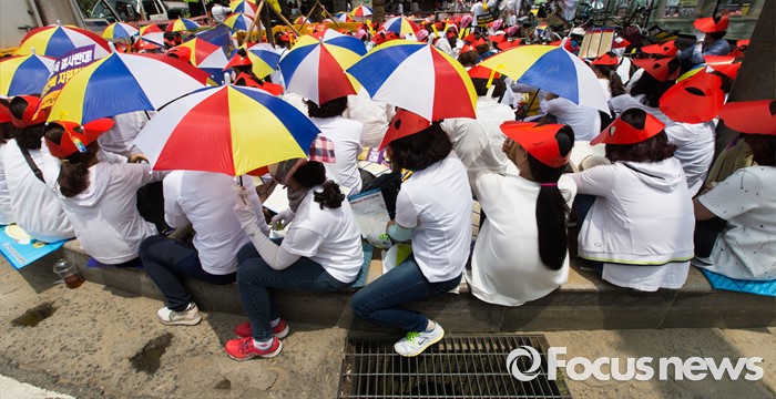 (서울=포커스뉴스) 13일 오후 서울 여의도 KB국민은행 앞에서 한국가정어린이집연합회 회원들이 맞춤형 보육 저지와 누리과정 예산 해결 및 평등지원을 촉구하는 결의대회를 하고 있다.
