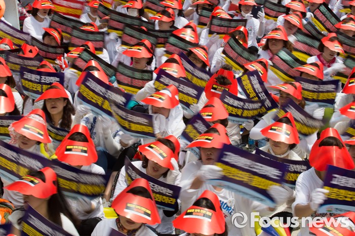 (서울=포커스뉴스) 13일 오후 서울 여의도 KB국민은행 앞에서 한국가정어린이집연합회 회원들이 맞춤형 보육 저지와 누리과정 예산 해결 및 평등지원 촉구하는 율동을 선보이고 있다.