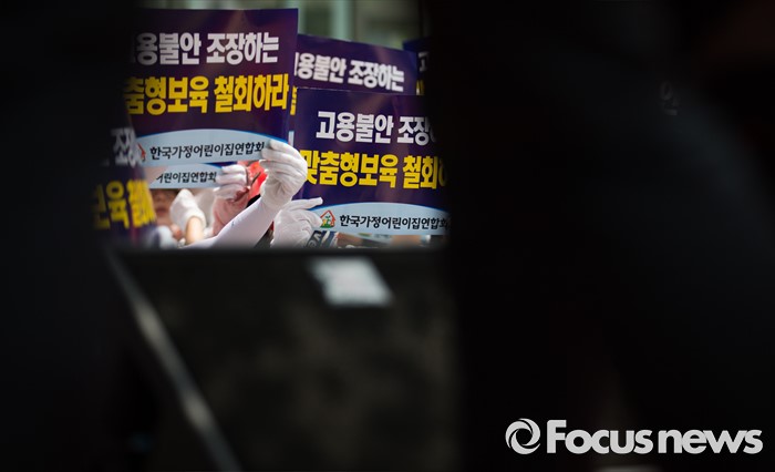 (서울=포커스뉴스) 13일 오후 서울 여의도 KB국민은행 앞에서 한국가정어린이집연합회 회원들이 맞춤형 보육 저지와 누리과정 예산 해결 및 평등지원 촉구 결의대회를 하고 있다.