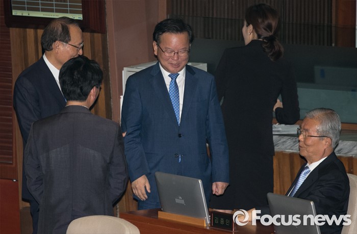 (서울=포커스뉴스) 13일 오후 서울 여의도 국회에서 상임위원장 선출을 위해 열린 343회 국회(임시회) 2차 본회의에 참석한 김종인 더불어민주당 비대위 대표와 김부겸 의원 등이 대화하고 있다.