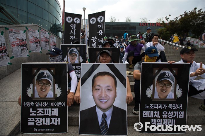 | △ 노점상대회에 참석한 유성범대위 회원들과 故 한광호씨의 영정 |